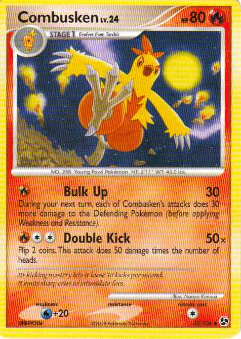 | | Evne2 | [R] Bulk Up (30) During your next turn, each of Combusken's attacks does 30 more damage to the Defending Pokemon (before applying Weakness and Resistance). [CCR] Double Kick (50x) Flip 2 coins. This attack does 50 damage times the number of heads.