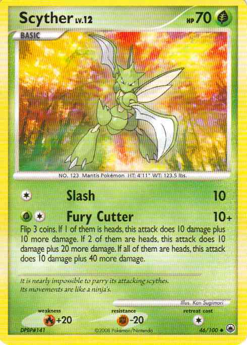 | | Evne2 | [C] Slash (10) [CG] Fury Cutter (10+) Flip 3 coins. If 1 of them is heads, this attack does 10 damage plus 10 more damage. If 2 of them are heads, this attack does 10 damage plus 20 more damage. If all of them are heads, this attack does 10 damage plus 40 more damage.
