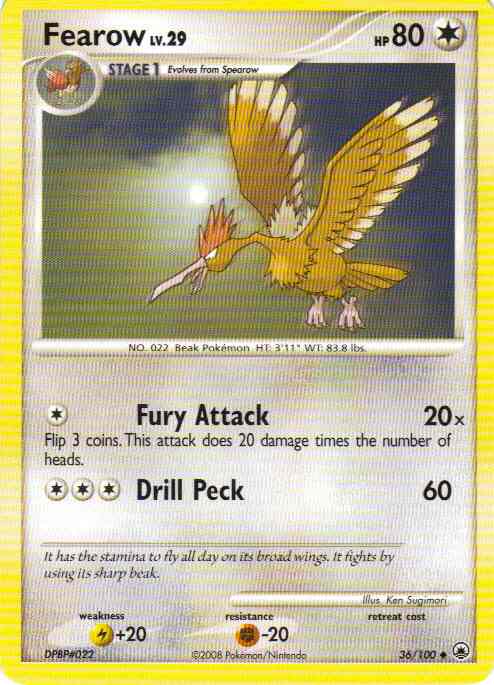 | Type | Colorless | | Pokemon serie | Majestic Dawn | | Stadie | Stage 1 | | HP | 80.0 | | Sjældenhed | Uncommon | | Tilbagetrækning | 0.0 | | Modstand | F-20 | | Svaghed | L+20 | | Kortnummer | 36 | | Evne | [C] Fury Attack (20x) Flip 3 coins. This attack does 20 damage times the number of heads. [CCC] Drill Peck (60)