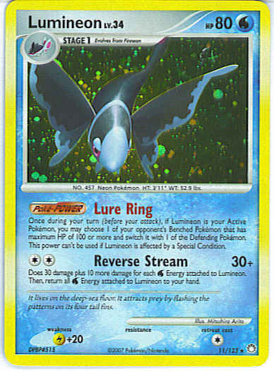 | Type | Water | | Pokemon serie | Mysterious Treasures | | Stadie | Stage 1 | | HP | 80 | | Sjældenhed | Rare | | Tilbagetrækning | 1 | | Svaghed | L+20 | | Kortnummer | 11 | | Evne | [CC] Reverse Stream (30+) Does 30 damage plus 10 more damage for each W Energy attached to Lumineon. Then, return all W Energy attached to Lumineon to your hand.