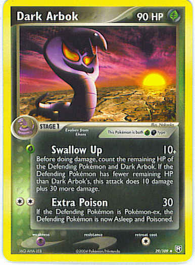| Type | Darkness Grass | | Pokemon serie | Team Rocket Returns | | Stadie | Stage 1 | | HP | 90 | | Sjældenhed | Uncommon | | Tilbagetrækning | 1 | | Svaghed | P | | Kortnummer | 29 | | Evne | [G] Swallow Up (10+) Before doing damage, count the number of remaining HP of the Defending Pokemon and Dark Arbok. If the Defending Pokemon has fewer remaining HP than Dark Arbok's, this attack does 10 damage plus 30 more damage. [CC] Extra Poison (30) If the Defending Pokemon is Pokemon-ex, the Defending Pokemon is now Asleep and Poisoned. | | Evne2 | [G] Swallow Up (10+) Before doing damage, count the number of remaining HP of the Defending Pokemon and Dark Arbok. If the Defending Pokemon has fewer remaining HP than Dark Arbok's, this attack does 10 damage plus 30 more damage. [CC] Extra Poison (30) If the Defending Pokemon is Pokemon-ex, the Defending Pokemon is now Asleep and Poisoned. | | Kunstner | Nakaoka |