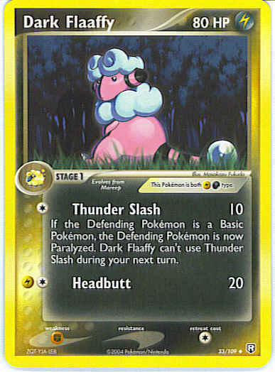 | Type | Darkness Lightning | | Pokemon serie | Team Rocket Returns | | Stadie | Stage 1 | | HP | 80 | | Sjældenhed | Uncommon | | Tilbagetrækning | 1 | | Svaghed | F | | Kortnummer | 33 | | Evne | [C] Thunder Slash (10) If the Defending Pokemon is a Basic Pokemon, the Defending Pokemon is now Paralyzed. Dark Flaaffy can't use Thunder Slash during your next turn. [CL] Headbutt (20) | | Evne2 | [C] Thunder Slash (10) If the Defending Pokemon is a Basic Pokemon, the Defending Pokemon is now Paralyzed. Dark Flaaffy can't use Thunder Slash during your next turn. [CL] Headbutt (20) | | Kunstner | Masakazu Fukuda |