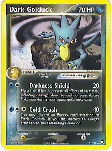 | Type | Darkness Water | | Pokemon serie | Team Rocket Returns | | Stadie | Stage 1 | | HP | 70 | | Sjældenhed | Uncommon | | Tilbagetrækning | 1 | | Svaghed | L | | Kortnummer | 35 | | Evne | [CW] Darkness Shield (20) Flip a coin. If heads, prevent all effects of an attack, including damage, done to each of your Active Pokemon during your opponent's next turn. [CCW] Cold Crush (40) You may discard an Energy card attached to Dark Golduck. If you do, discard an Energy attached to the Defending Pokemon. | | Evne2 | [CW] Darkness Shield (20) Flip a coin. If heads, prevent all effects of an attack, including damage, done to each of your Active Pokemon during your opponent's next turn. [CCW] Cold Crush (40) You may discard an Energy card attached to Dark Golduck. If you do, discard an Energy attached to the Defending Pokemon. | | Kunstner | Nakaoka |