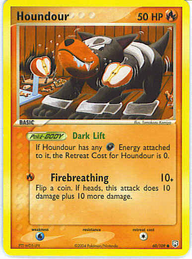 | Type | Fire | | Pokemon serie | Team Rocket Returns | | Stadie | Basic | | HP | 50 | | Sjældenhed | Common | | Tilbagetrækning | 1 | | Svaghed | W | | Kortnummer | 60 | | Evne | [R] Firebreathing (10+) Flip a coin. If heads, this attack does 10 damage plus 10 more damage. | | Evne2 | [R] Firebreathing (10+) Flip a coin. If heads, this attack does 10 damage plus 10 more damage. | | Kunstner | Tomokazu Komiya |