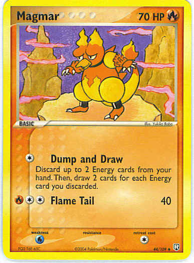 | Type | Fire | | Pokemon serie | Team Rocket Returns | | Stadie | Basic | | HP | 70 | | Sjældenhed | Uncommon | | Tilbagetrækning | 1 | | Svaghed | W | | Kortnummer | 44 | | Evne | [C] Dump and Draw - Discard up to 2 Energy cards from your hand. Then, draw 2 cards for each Energy card you discarded. [CCR] Flame Tail (40) | | Evne2 | [C] Dump and Draw - Discard up to 2 Energy cards from your hand. Then, draw 2 cards for each Energy card you discarded. [CCR] Flame Tail (40) | | Kunstner | Yukiko Baba |