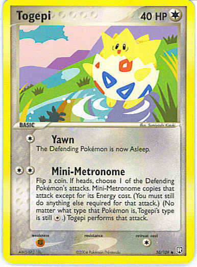 | Type | Colorless | | Pokemon serie | Team Rocket Returns | | Stadie | Basic | | HP | 40 | | Sjældenhed | Uncommon | | Tilbagetrækning | 1 | | Svaghed | F | | Kortnummer | 50 | | Evne | [C] Yawn - The Defending Pokemon is now Asleep. [CC] Mini-Metronome - Flip a coin. If heads, choose 1 of the Defending Pokemon's attacks. Mini-Metronome copies that attack except for its Energy cost. (You must still do anything else required for that attack.) (No matter what type that Pokemon is, Togepi's type is still Colorless.) Togepi performs that attack. | | Evne2 | [C] Yawn - The Defending Pokemon is now Asleep. [CC] Mini-Metronome - Flip a coin. If heads, choose 1 of the Defending Pokemon's attacks. Mini-Metronome copies that attack except for its Energy cost. (You must still do anything else required for that attack.) (No matter what type that Pokemon is, Togepi's type is still Colorless.) Togepi performs that attack. | | Kunstner | Sumiyoshi Kizuki |