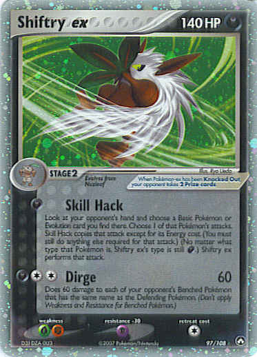 [D] Skill Hack - Look at your opponent's hand and choose a Basic Pokemon or Evolution card you find there. Choose 1 of that Pokemon's attacks. Skill Hack copies that attack except for its Energy cost. (You must still do anything else required for that attack.) (No matter what type that Pokemon is, Shiftry ex's type is still D.) Shiftry ex performs that attack.
