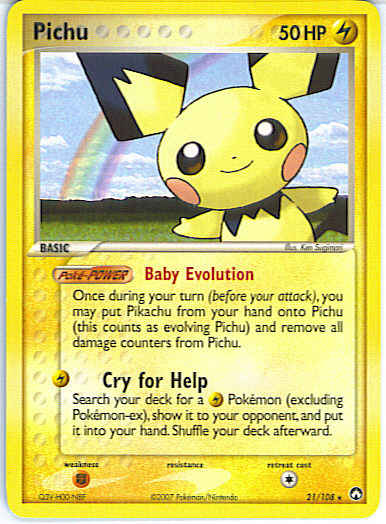 | Type | Lightning | | Pokemon serie | Power Keepers | | Stadie | Basic | | HP | 50 | | Sjældenhed | Rare | | Tilbagetrækning | 1 | | Svaghed | F | | Kortnummer | 21 | | Evne |