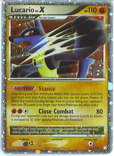 | Type | Fighting | | Pokemon serie | Mysterious Treasures | | Stadie | Level Up | | HP | 110 | | Sjældenhed | Ultra-Rare | | Tilbagetrækning | 1 | | Svaghed | Px2 | | Kortnummer | 122 | | Evne | of an attack, including damage, done to Lucario during your opponent's next turn. (If Lucario is no longer your Active Pokemon, this effect ends.) (Poke-POWER)