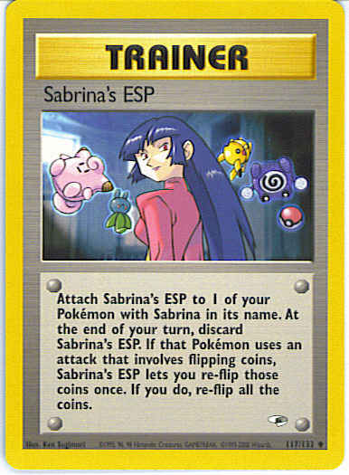 Attach Sabrina's ESP to 1 of your Pokemon with Sabrina in its name. At the end of your turn, discard Sabrina's ESP. If that Pokemon uses an attack that involves flipping coins, Sabrina's ESP lets you re-flip those coins once. If you do, re-flip all the coins.