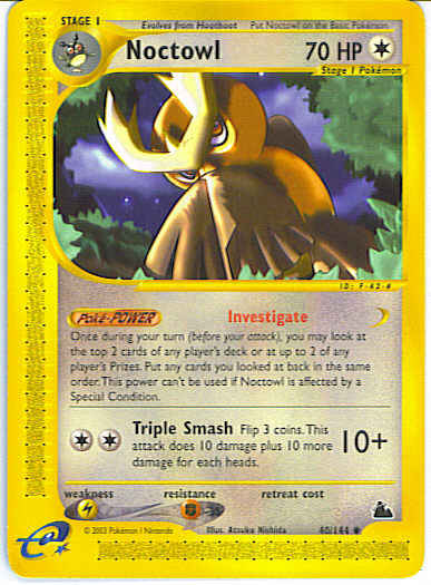 | Type | Colorless | | Pokemon serie | Skyridge | | Stadie | Stage 1 | | HP | 70 | | Sjældenhed | Uncommon | | Modstand | F | | Svaghed | L | | Kortnummer | 40 | | Evne | [CC] Triple Smash (10+) Flip 3 coins. This attack does 10 damage plus 10 more damage for each heads.
