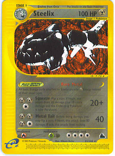 | Type | Metal | | Pokemon serie | Skyridge | | Stadie | Stage 1 | | HP | 100 | | Sjældenhed | Rare | | Tilbagetrækning | 4 | | Modstand | G | | Svaghed | R | | Kortnummer | 31 | | Evne | [CMM] Squeeze (20+) Flip a coin. If heads, this attack does 20 damage plus 10 more damage and the Defending Pokemon is now Paralyzed. [CMMM] Metal Tail (40) Before doing damage, you may flip a coin. If heads, this attack does 80 damage. If tails, this attack does nothing.