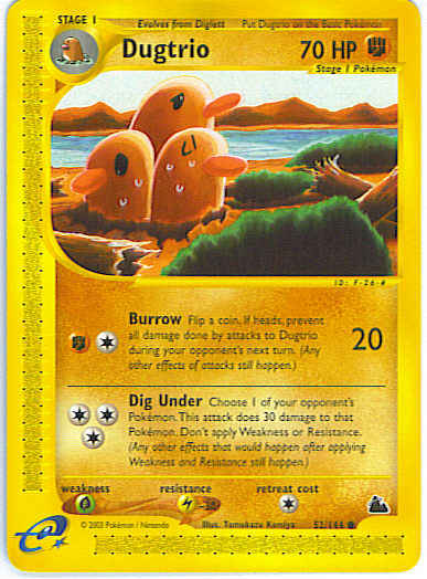 | | Evne2 | [CF] Burrow (20) Flip a coin. If heads, prevent all damage done by attacks to Dugtrio during your opponent's next turn. (any other effects of attacks still happen.) [CCC] Dig Under - Choose 1 of your opponent's Pokemon. This attack does 30 damage to that Pokemon. Don't apply Weakness or Resistance. (any other effects that would happen after applying Weakness and Resistance still happen.)