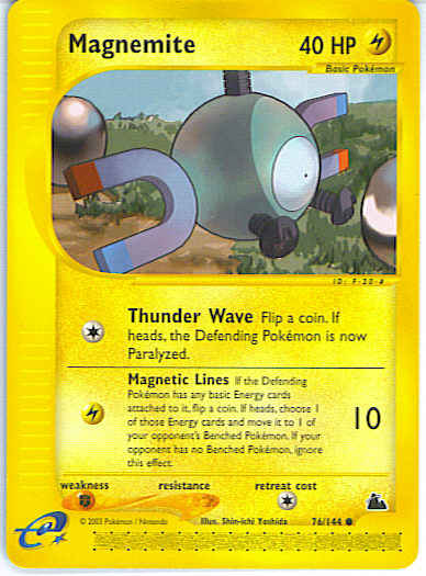 | Type | Lightning | | Pokemon serie | Skyridge | | Stadie | Basic | | HP | 40 | | Sjældenhed | Common | | Tilbagetrækning | 1 | | Svaghed | F | | Kortnummer | 76 | | Evne | [C] Thunder Wave - Flip a coin. If heads, the Defending Pokemon is now Paralyzed. [L] Magnetic Lines (10) If the Defending Pokemon has any basic Energy cards attached to it, flip a coin. If heads, choose 1 of those Energy cards and move it to 1 of your opponent's Benched Pokemon. If your opponent has no Benched Pokemon, ignore this effect.