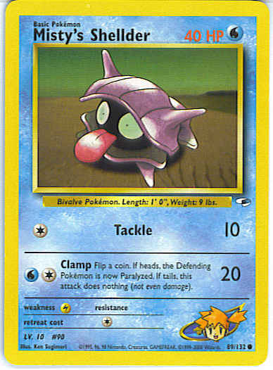 | Type | Water | | Pokemon serie | Gym Heroes | | Stadie | Basic | | HP | 40 | | Sjældenhed | Common | | Tilbagetrækning | 1 | | Svaghed | L | | Kortnummer | 89 | | Evne |