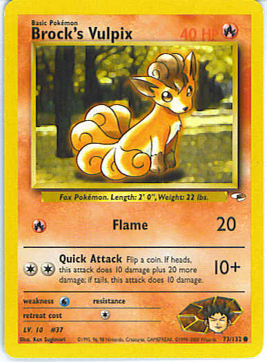 | Type | Fire | | Pokemon serie | Gym Heroes | | Stadie | Basic | | HP | 40 | | Sjældenhed | Common | | Tilbagetrækning | 1 | | Svaghed | W | | Kortnummer | 73 | | Evne |
