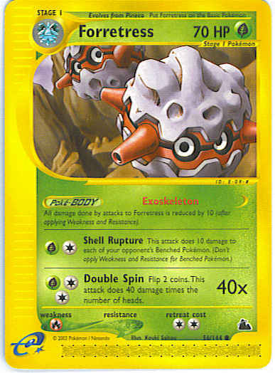 | Type | Grass | | Pokemon serie | Skyridge | | Stadie | Stage 1 | | HP | 70 | | Sjældenhed | Common | | Tilbagetrækning | 2 | | Svaghed | R | | Kortnummer | 56 | | Evne | [CG] Shell Rupture - This attack does 10 damage to each of your opponent's Benched Pokemon. (Don't apply Weakness and Resistance for Benched Pokemon.) [CCG] Double Spin (40x) Flip 2 coins. This attack does 40 damage times the number of heads.