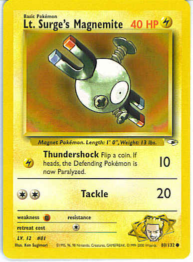 | Type | Lightning | | Pokemon serie | Gym Heroes | | Stadie | Basic | | HP | 40 | | Sjældenhed | Common | | Tilbagetrækning | 1 | | Svaghed | F | | Kortnummer | 80 | | Evne |