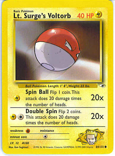 | Type | Lightning | | Pokemon serie | Gym Heroes | | Stadie | Basic | | HP | 40 | | Sjældenhed | Common | | Tilbagetrækning | 1 | | Svaghed | F | | Kortnummer | 84 | | Evne |