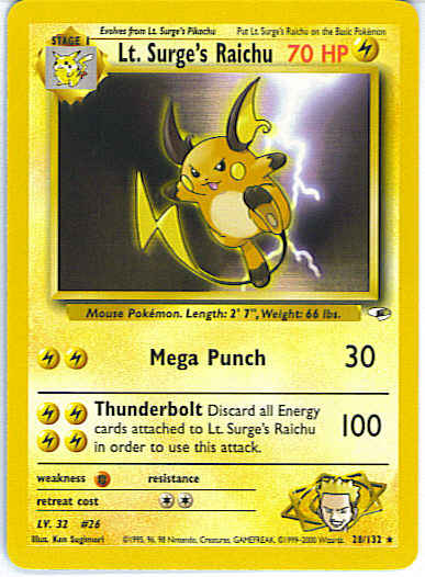 [LLLL] Thunderbolt (100) Discard all Energy cards attached to Lt. Surge's Raichu in order to use this attack.