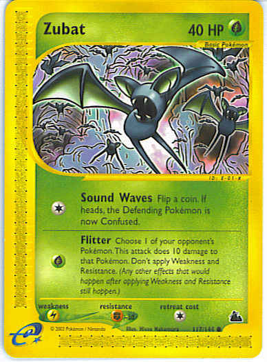 | | Evne2 | [C] Sound Waves - Flip a coin. If heads, the Defending Pokemon is now Confused. [G] Flitter - Choose 1 of your opponent's Pokemon. This attack does 10 damage to that Pokemon. Don't apply Weakness and Resistance. (Any other effects that would happen after applying Weakness and Resistance still happen.)