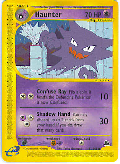 | Type | Psychic | | Pokemon serie | Skyridge | | Stadie | Stage 1 | | HP | 70 | | Sjældenhed | Common | | Tilbagetrækning | 1 | | Modstand | F | | Svaghed | D | | Kortnummer | 63 | | Evne | [CC] Confuse Ray (10) Flip a coin. If heads, the Defending Pokemon is now Confused. [CCP] Shadow Hand (30) You may discard up to 2 cards from your hand. If you do, draw that many cards.
