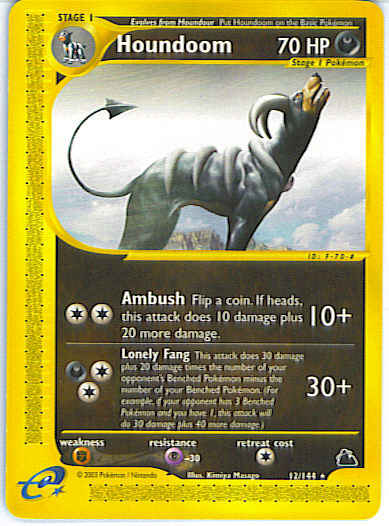 | Type | Darkness | | Pokemon serie | Skyridge | | Stadie | Stage 1 | | HP | 70 | | Sjældenhed | Rare | | Tilbagetrækning | 1 | | Modstand | P | | Svaghed | F | | Kortnummer | 12 | | Evne | [CC] Ambush (10+) Flip a coin. If heads, this attack does 10 damage plus 20 more damage. [CCD] Lonely Fang (30+) This attack does 30 damage plus 20 damage times the number of your opponent's Benched Pokemon minus the number of your Benched Pokemon. (For example, if your opponent has 3 Benched Pokemon and you have 1, this attack will do 30 damage plus 40 more damage.
