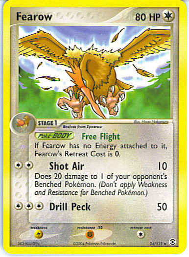 | Type | Colorless | | Pokemon serie | Fire Red Leaf Green | | Stadie | Stage 1 | | HP | 80 | | Sjældenhed | Rare | | Tilbagetrækning | 1 | | Modstand | F | | Svaghed | L | | Kortnummer | 24 | | Evne | [CC] Shot Air (10) Does 20 damage to 1 of your opponent's Benched Pokemon. (Don't apply Weakness and Resistance for Benched Pokemon.) [CCC] Drill Peck (50) | | Evne2 | [CC] Shot Air (10) Does 20 damage to 1 of your opponent's Benched Pokemon. (Don't apply Weakness and Resistance for Benched Pokemon.) [CCC] Drill Peck (50) | | Kunstner | Hisao Nakamura |