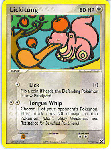 | Type | Colorless | | Pokemon serie | Fire Red Leaf Green | | Stadie | Basic | | HP | 80 | | Sjældenhed | Uncommon | | Tilbagetrækning | 2 | | Svaghed | F | | Kortnummer | 37 | | Evne | [C] Lick (10) Flip a coin. If heads, the Defending Pokemon is now Paralyzed. [CC] Tongue Whip - Choose 1 of your opponent's Pokemon. This attack does 20 damage to that Pokemon. (Don't apply Weakness and Resistance for Benched Pokemon.) | | Evne2 | [C] Lick (10) Flip a coin. If heads, the Defending Pokemon is now Paralyzed. [CC] Tongue Whip - Choose 1 of your opponent's Pokemon. This attack does 20 damage to that Pokemon. (Don't apply Weakness and Resistance for Benched Pokemon.) | | Kunstner | Sumiyoshi Kizuki |