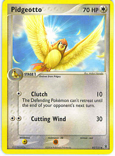 | Type | Colorless | | Pokemon serie | Fire Red Leaf Green | | Stadie | Stage 1 | | HP | 70 | | Sjældenhed | Uncommon | | Modstand | F | | Svaghed | L | | Kortnummer | 45 | | Evne | [C] Clutch (10) The Defending Pokemon can't retreat until the end of your opponent's next turn. [CC] Cutting Wind (30) | | Evne2 | [C] Clutch (10) The Defending Pokemon can't retreat until the end of your opponent's next turn. [CC] Cutting Wind (30) | | Kunstner | Midori Harada |