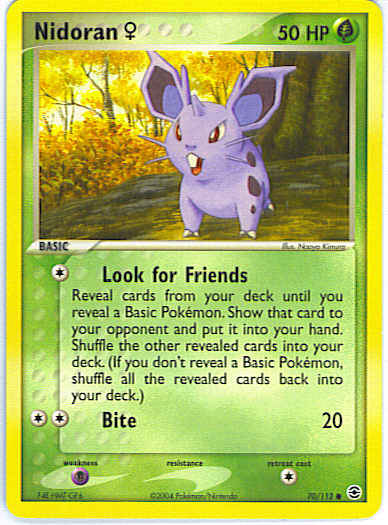 | Type | Grass | | Pokemon serie | Fire Red Leaf Green | | Stadie | Basic | | HP | 50 | | Sjældenhed | Common | | Tilbagetrækning | 1 | | Svaghed | P | | Kortnummer | 70 | | Evne | [C] Look for Friends - Reveal cards from your deck until you reveal a Basic Pokemon. Show that card to your opponent and put it into your hand. Shuffle the other revealed cards back into your deck. (If you don't reveal a Basic Pokemon, shuffle all the revealed cards back into your deck.) [CC] Bite (20) | | Evne2 | [C] Look for Friends - Reveal cards from your deck until you reveal a Basic Pokemon. Show that card to your opponent and put it into your hand. Shuffle the other revealed cards back into your deck. (If you don't reveal a Basic Pokemon, shuffle all the revealed cards back into your deck.) [CC] Bite (20) | | Kunstner | Naoyo Kimura |