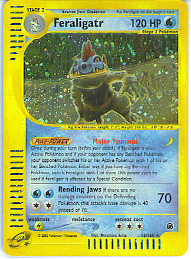 | Type | Water | | Pokemon serie | Expedition | | Stadie | Stage 2 | | HP | 120 | | Sjældenhed | Rare | | Tilbagetrækning | 3 | | Svaghed | L | | Kortnummer | 12 | | Evne |