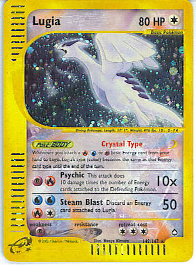 | Type | Colorless | | Pokemon serie | Aquapolis | | Stadie | Basic | | HP | 80 | | Sjældenhed | Rare | | Tilbagetrækning | 3 | | Svaghed | P | | Kortnummer | 149 | | Evne | [PR] Psychic (10x) Does 10 damage times the number of Energy cards attached to the Defending Pokemon. [CRWW] Steam Blast (50) Discard 1 Energy card attached to Lugia.