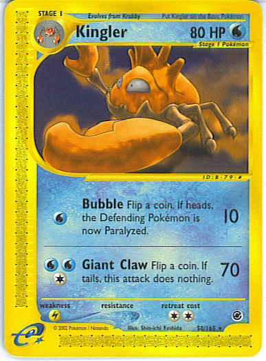 | Type | Water | | Pokemon serie | Expedition | | Stadie | Stage 1 | | HP | 80 | | Sjældenhed | Rare | | Tilbagetrækning | 2 | | Svaghed | L | | Kortnummer | 50 | | Evne |