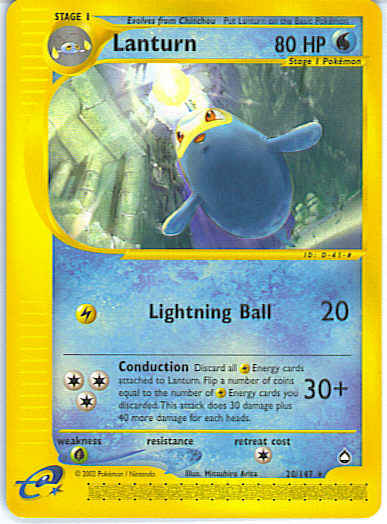 | Type | Water | | Pokemon serie | Aquapolis | | Stadie | Stage 1 | | HP | 80 | | Sjældenhed | Rare | | Tilbagetrækning | 1 | | Svaghed | G | | Kortnummer | 20 | | Evne | [L] Lightning Ball (20) [CCC] Conduction (30+) Discard all L Energy cards attached to Lantern. Flip a number of coins equal to the number of L Energy cards you discarded. This attack does 30 plus 40 more damage for each heads.