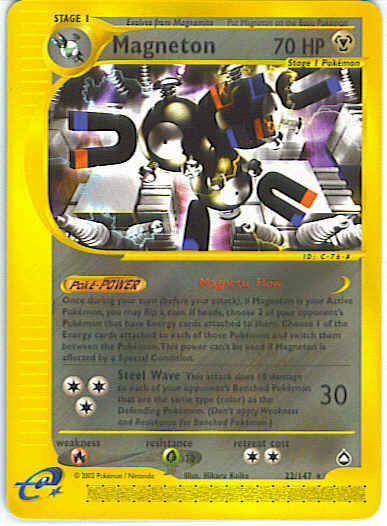 | Type | Metal | | Pokemon serie | Aquapolis | | Stadie | Stage 1 | | HP | 70 | | Sjældenhed | Rare | | Tilbagetrækning | 2 | | Modstand | G | | Svaghed | R | | Kortnummer | 22 | | Evne | [CCC] Steel Wave (30) Does 10 damage to each of your opponent's Benched Pokemon of the same type as the Defending Pokemon. (Don't apply Weakness and Resistance for Benched Pokemon.)