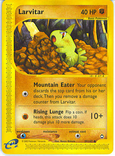 | Type | Fighting | | Pokemon serie | Aquapolis | | Stadie | Basic | | HP | 40 | | Sjældenhed | Common | | Tilbagetrækning | 1 | | Svaghed | W | | Kortnummer | 89 | | Evne | [C] Mountain Eater - Discard the top card of your opponent's deck. Then, remove 1 damage counter from Larvitar. [F] Rising Lunge (10+) Flip a coin. If heads, this attack does 10 damage plus 10 more damage.