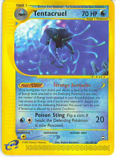 | Type | Water | | Pokemon serie | Aquapolis | | Stadie | Stage 1 | | HP | 70 | | Sjældenhed | Rare | | Svaghed | L | | Kortnummer | 38 | | Evne | [CW] Poison Sting (20) Flip a coin. If heads, the Defending Pokemon is now Poisoned.
