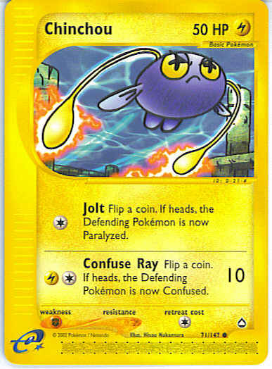 | Type | Lightning | | Pokemon serie | Aquapolis | | Stadie | Basic | | HP | 50 | | Sjældenhed | Common | | Tilbagetrækning | 1 | | Svaghed | F | | Kortnummer | 71 | | Evne | [C] Jolt - Flip a coin. If heads, the Defending Pokemon is now Paralyzed. [CL] Confuse Ray (10) Flip a coin. If heads, the Defending Pokemon is now Confused.