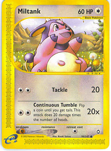 | Type | Colorless | | Pokemon serie | Aquapolis | | Stadie | Basic | | HP | 60 | | Sjældenhed | Common | | Tilbagetrækning | 1 | | Svaghed | F | | Kortnummer | 94 | | Evne | [CC] Tackle (20) [CC] Continuous Tumble (20x) Flip a coin until you get tails. This attack does 20 damage times the number of heads.
