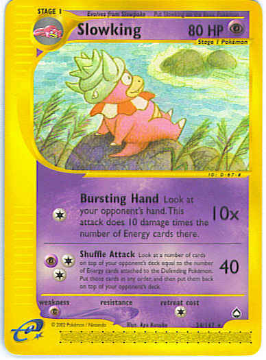 | Evne | [C] Bursting Hand (10x) Look at your opponent's hand. This attack does 10 damage times the number of Energy cards in your opponent's hand. [CCP] Shuffle Attack (40) Look at a number of cards from the top of your opponent's deck equal to the number of Energy cards attached to the Defending Pokemon and rearrange them as you like.