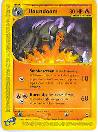 | Type | Fire | | Pokemon serie | Aquapolis | | Stadie | Stage 1 | | HP | 80 | | Sjældenhed | Rare | | Tilbagetrækning | 1 | | Svaghed | W | | Kortnummer | 14 | | Evne | [C] Smokescreen (10) If the defending Pokemon tries to attack during your opponent's next turn, your opponent flips a coin. If tails, that attack does nothing. [CRR] Burn Up (60) Flip a coin. If tails, discard all R Energy cards attached to Houndoom.
