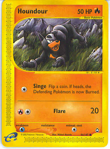 | Type | Fire | | Pokemon serie | Aquapolis | | Stadie | Basic | | HP | 50 | | Sjældenhed | Common | | Tilbagetrækning | 1 | | Svaghed | W | | Kortnummer | 86 | | Evne | [C] Singe - Flip a coin. If heads, the Defending Pokemon is now Burned. [CR] Flare (20)