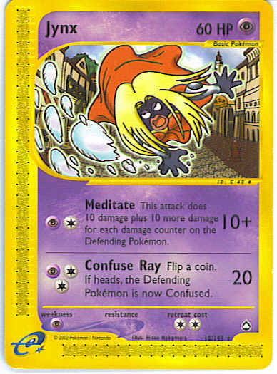 | Type | Psychic | | Pokemon serie | Aquapolis | | Stadie | Basic | | HP | 60 | | Sjældenhed | Rare | | Tilbagetrækning | 2 | | Svaghed | P | | Kortnummer | 18 | | Evne | [CP] Meditate (10+) This attack does 10 damage plus 10 more damage times the number of damage counters on the Defending Pokemon. [CCP] Confuse Ray (20) Flip a coin. If heads, the Defending Pokemon is now Confused.