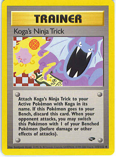 Attach Koga's Ninja Trick to your Active Pokemon with Koga in its name. If this Pokemon goes to your Bench, discard this card. When your opponent attacks, you may switch this Pokemon with 1 of your Benched Pokemon (before damage or other effects of attacks).