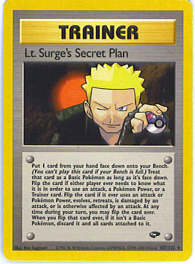 Put 1 card from your hand face down onto your Bench. (You can't play this card if your Bench is full.) Treat that card as a Basic Pokemon as long as it's face down. Flip the card if either player ever needs to know what it is in order to use an attack, a Pokemon Power, or a Trainer card. Flip the card if it ever uses an attack or Pokemon Power, evolves, retreats, is damaged by an attack, or is otherwise affected by an attack. At any time during your turn, you may flip the card over. When you flip that card over, if it isn't a Basic Pokemon, discard it and all cards attached to it.