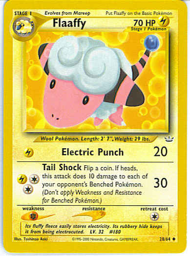 | Type | Lightning | | Pokemon serie | Neo Revelation | | Stadie | Stage 1 | | HP | 70 | | Sjældenhed | Uncommon | | Tilbagetrækning | 1 | | Svaghed | F | | Kortnummer | 28 | | Evne |