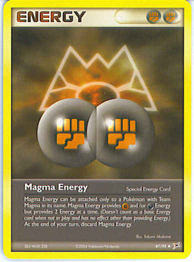 | Type | Energy | | Pokemon serie | Team Aqua-Team Magma | | Stadie | Special Energy | | Sjældenhed | Uncommon | | Kortnummer | 87 | | Evne | Magma Energy can be attached only to a Pokemon with Team Magma in its name. Magma Energy provides F and D Energy but provides 2 Energy at a time. (Doesn't count as a basic Energy card when not in play and has no effect other than providing Energy.) At the end of your turn, discard Magma Energy.