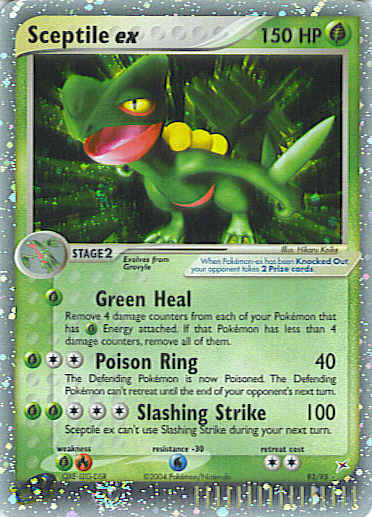 | | Evne2 | [C] Green Heal - Remove 4 damage counters from each of your Pokemon that has G Energy attached. If that Pokemon has less than 4 damage counters, remove all of them. [CCG] Poison Ring (40) The Defending Pokemon is now Poisoned. The Defending Pokemon can't retreat until the end of your opponent's next turn. [CCCGG] Slashing Strike (100) Sceptile ex can't use Slashing Strike during your next turn.