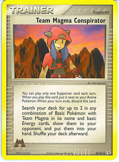 | Type | Trainer | | Pokemon serie | Team Aqua-Team Magma | | Stadie | Trainer (Supporter) | | Sjældenhed | Uncommon | | Kortnummer | 82 | | Evne | Search your deck for up to 2 in any combination of Basic Pokemon with Team Magma in its name and basic Energy cards, show them to your opponent, and put them into your hand. Shuffle your deck afterward.